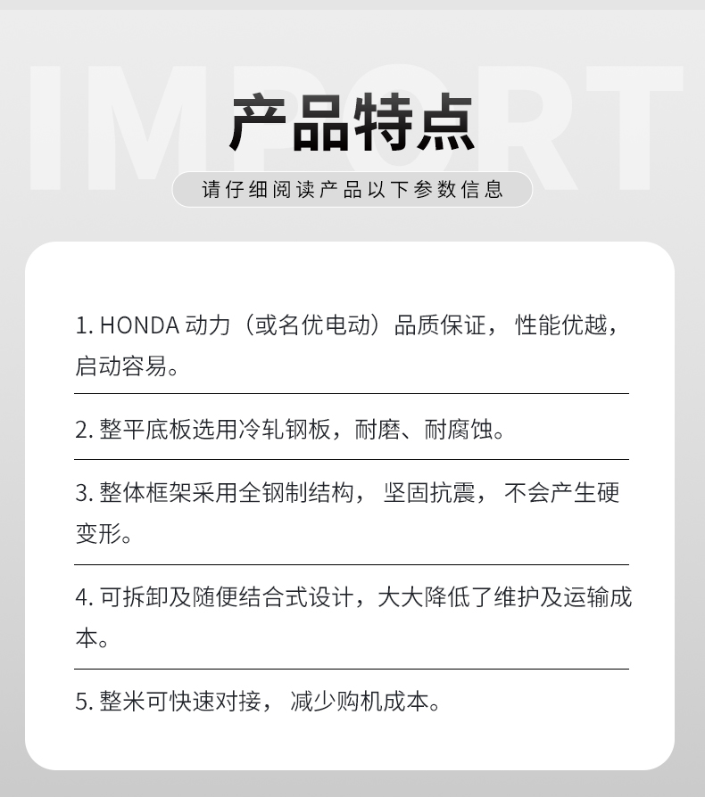 用于混凝土地面的提漿、壓實、整平、是修建公路、車間、廣場、現代化廠房的新型設備。是傳統攤鋪機的升級換代產品,汽油機動力及電動機可任意選擇。