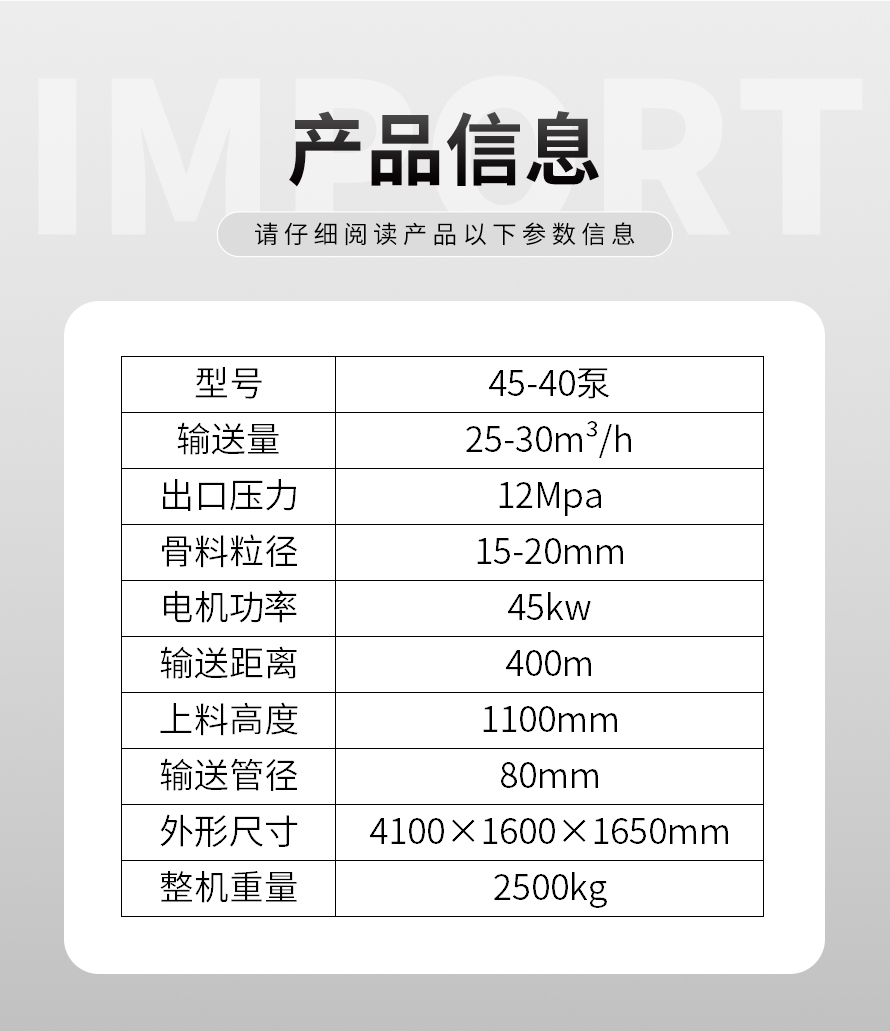 產品介紹: 1,大流量 采用加粗料缸,讓機械每一次循環出料多20% 2,效率高 移動便捷全部采用快接式管道卡,提高工作效率 3,便捷 本機可遠程遙控,操作不受地點限制,更加人性化 產品用途: 坡道灌漿,水平地面,隧道澆筑,模