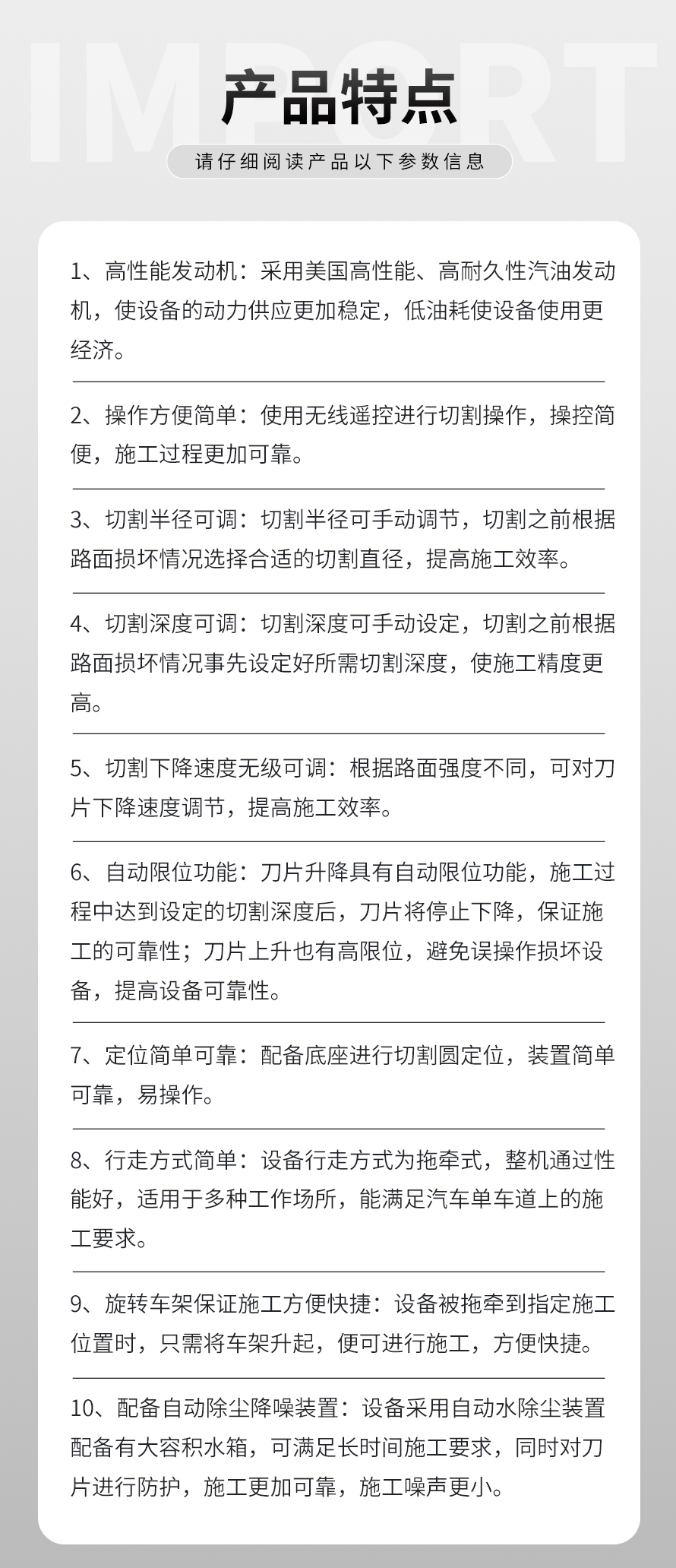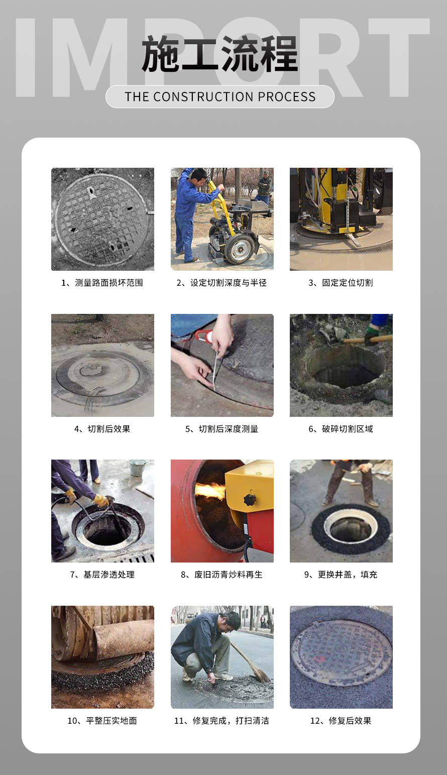 專門用于對城市道路中機動車道等井蓋周圍的水泥混凝土或瀝青路面進行圓形切割。為清楚井蓋周圍的破損路面提供分割區域,修復后的地面美觀,延長了路面的使用壽命。