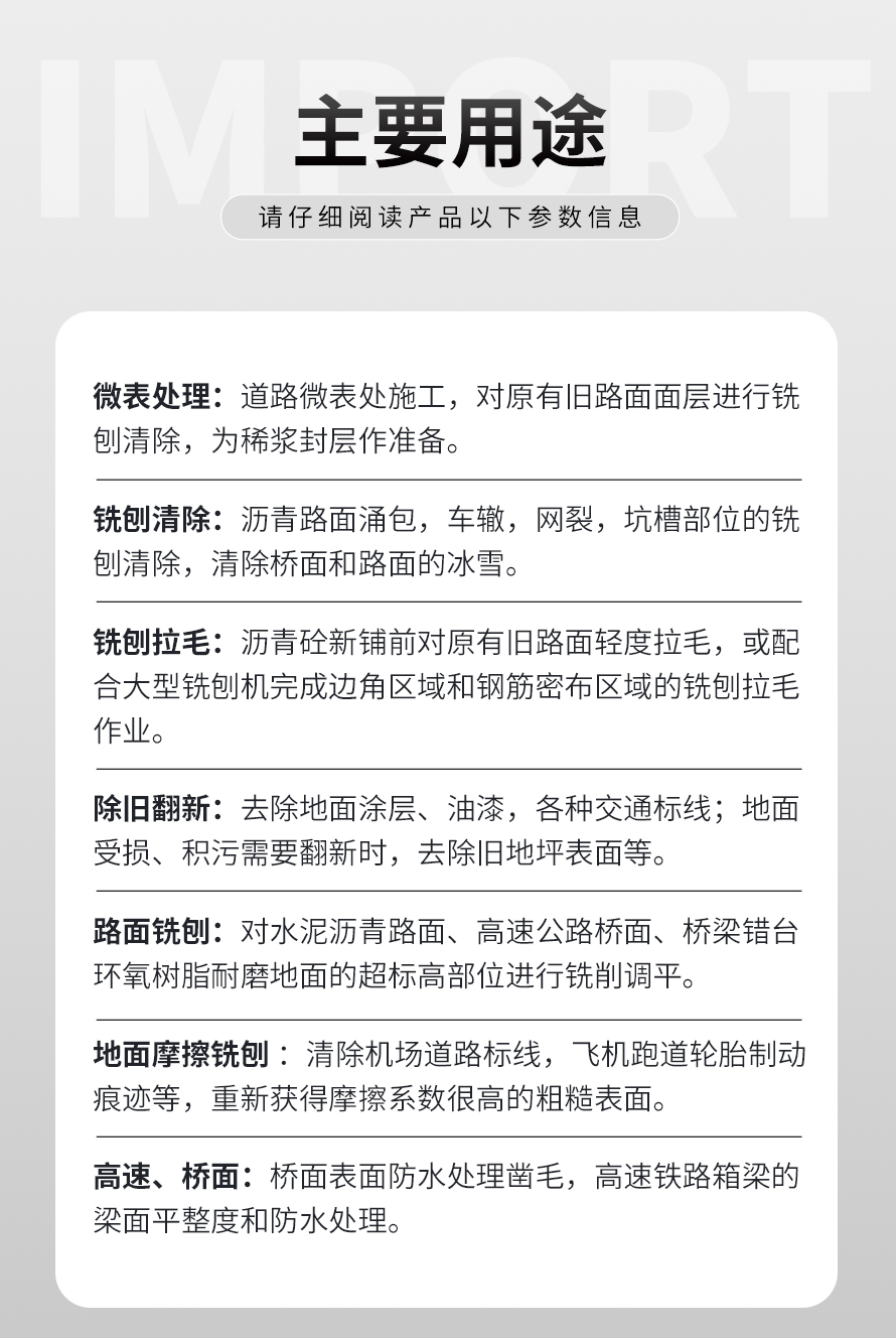 液壓銑刨機結構緊湊,布局合理,具有控制精度高、性能穩定、操作簡單、維護保養方便等優勢。其適合各種強度較高的混凝土瀝青等高出部分的去除工作,是其它類型的銑刨機無法替代的產品。