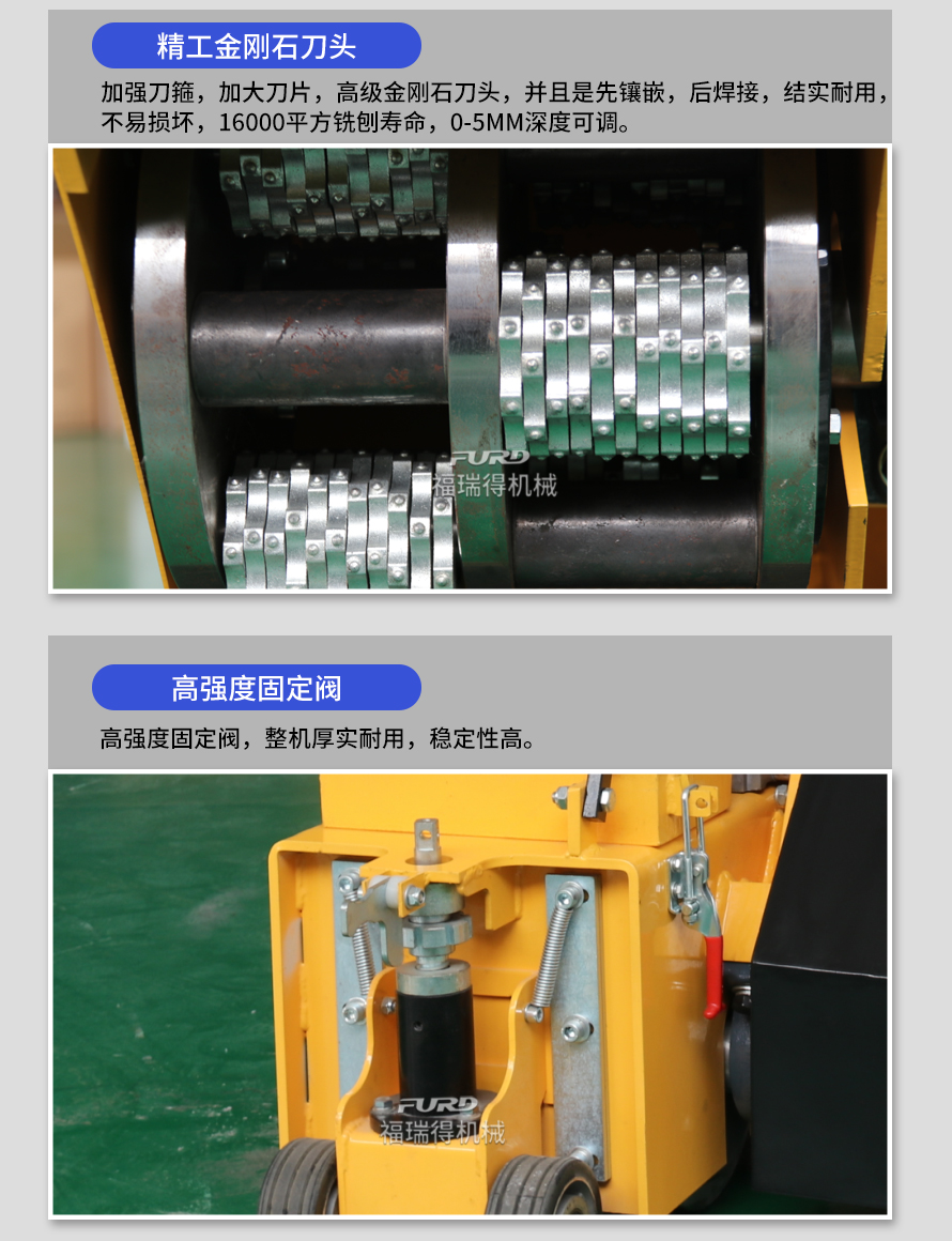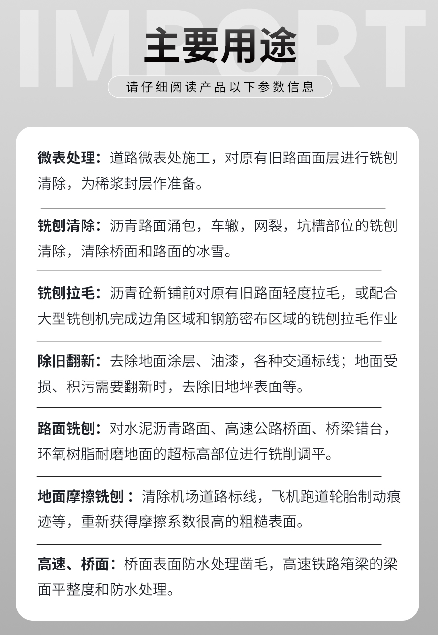 用于橋面鋪設瀝青或車間舊的混凝土地面重新攤鋪混凝土之前,清除水泥浮漿以及鏟平拉毛, 也用于清除建筑施工中的堅硬灰渣。