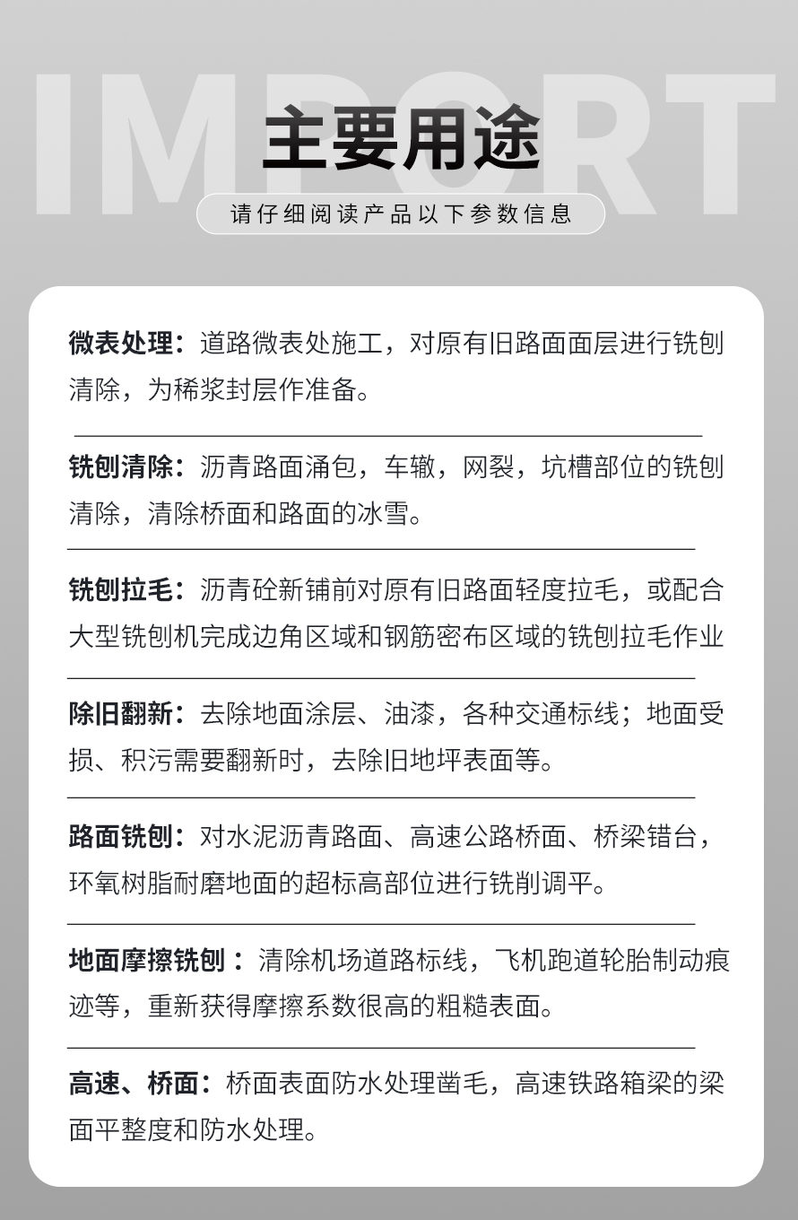用于橋面鋪設瀝青或車間舊的混凝土地面重新攤鋪混凝土之前,清除水泥浮漿以及鏟平拉毛, 也用于清除建筑施工中的堅硬灰渣。