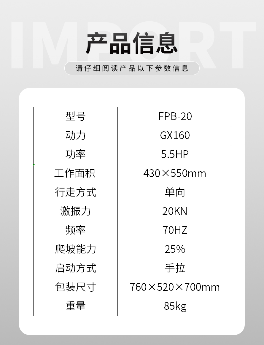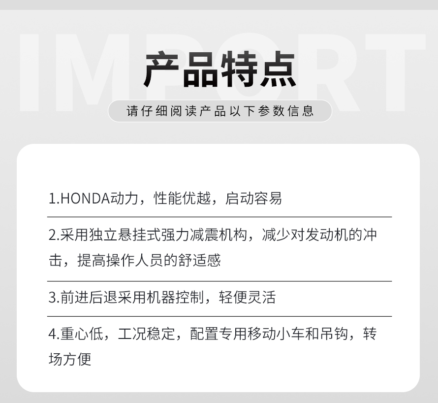 適用于路基邊緣、橋涵、管道、溝槽底部等狹長地帶的壓實。 本田汽油動力,名牌品質保證。